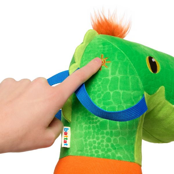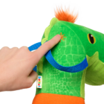 - Explore Textures: Kids can touch and feel fun textures on the dino’s head, reigns, and spiky hairdo!