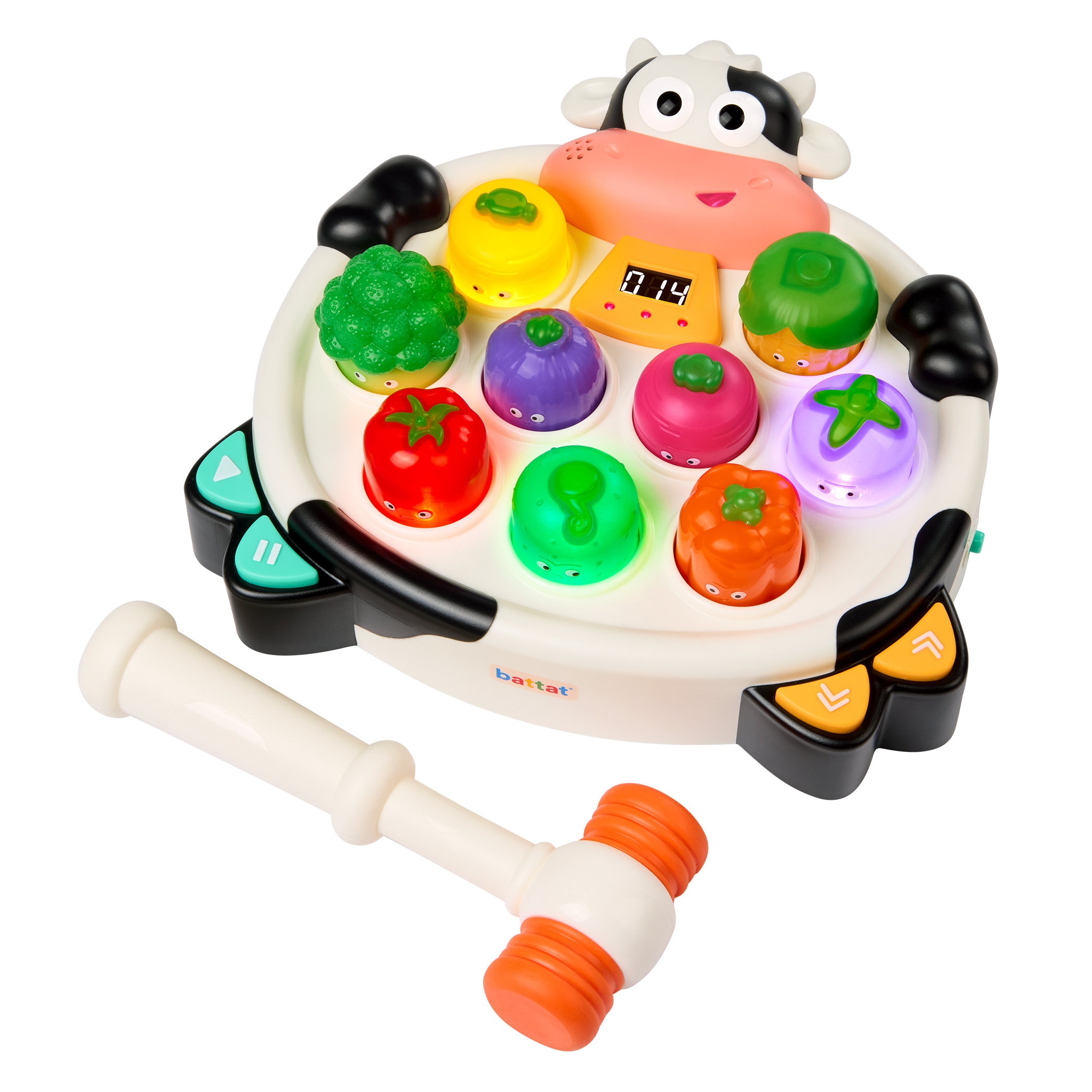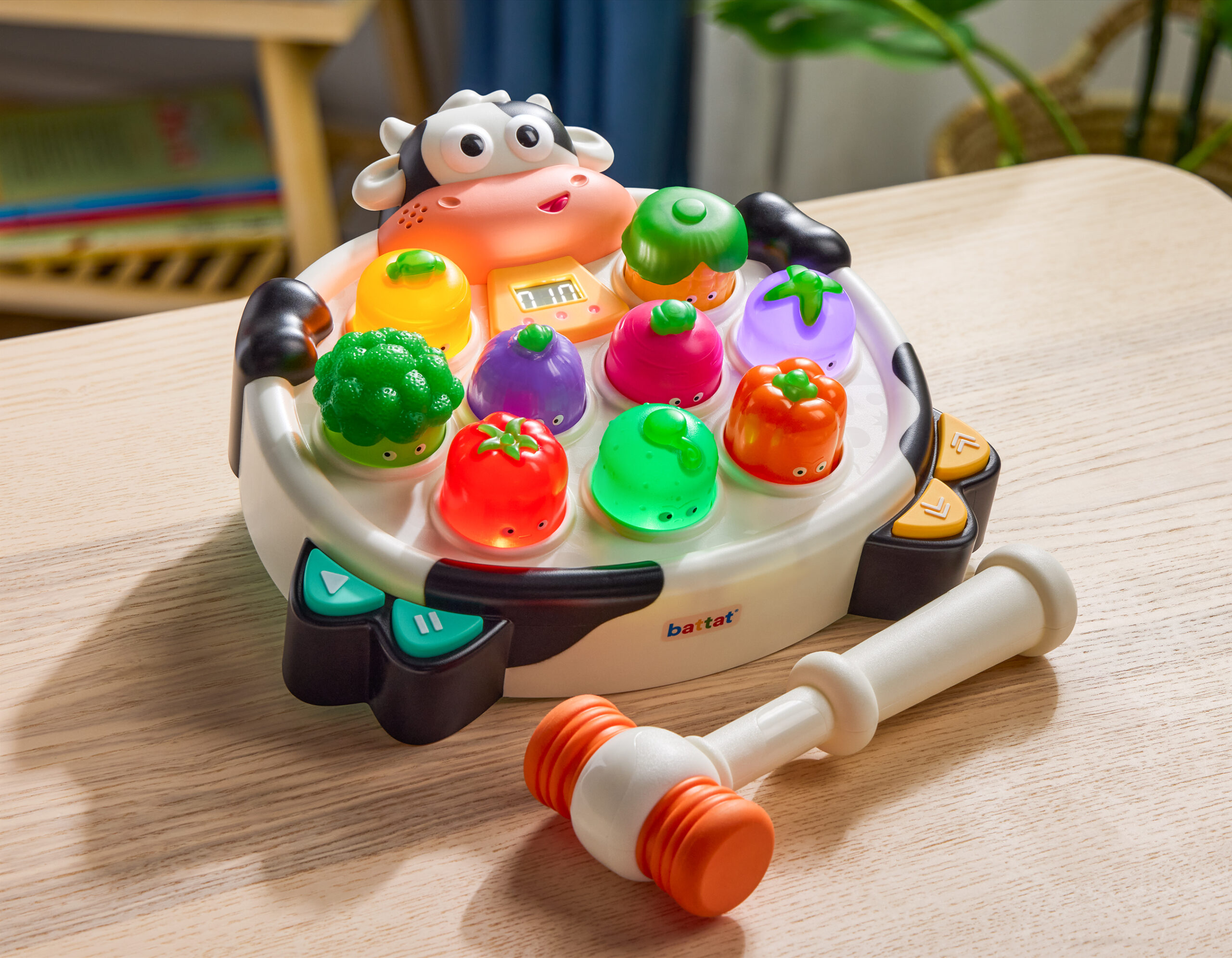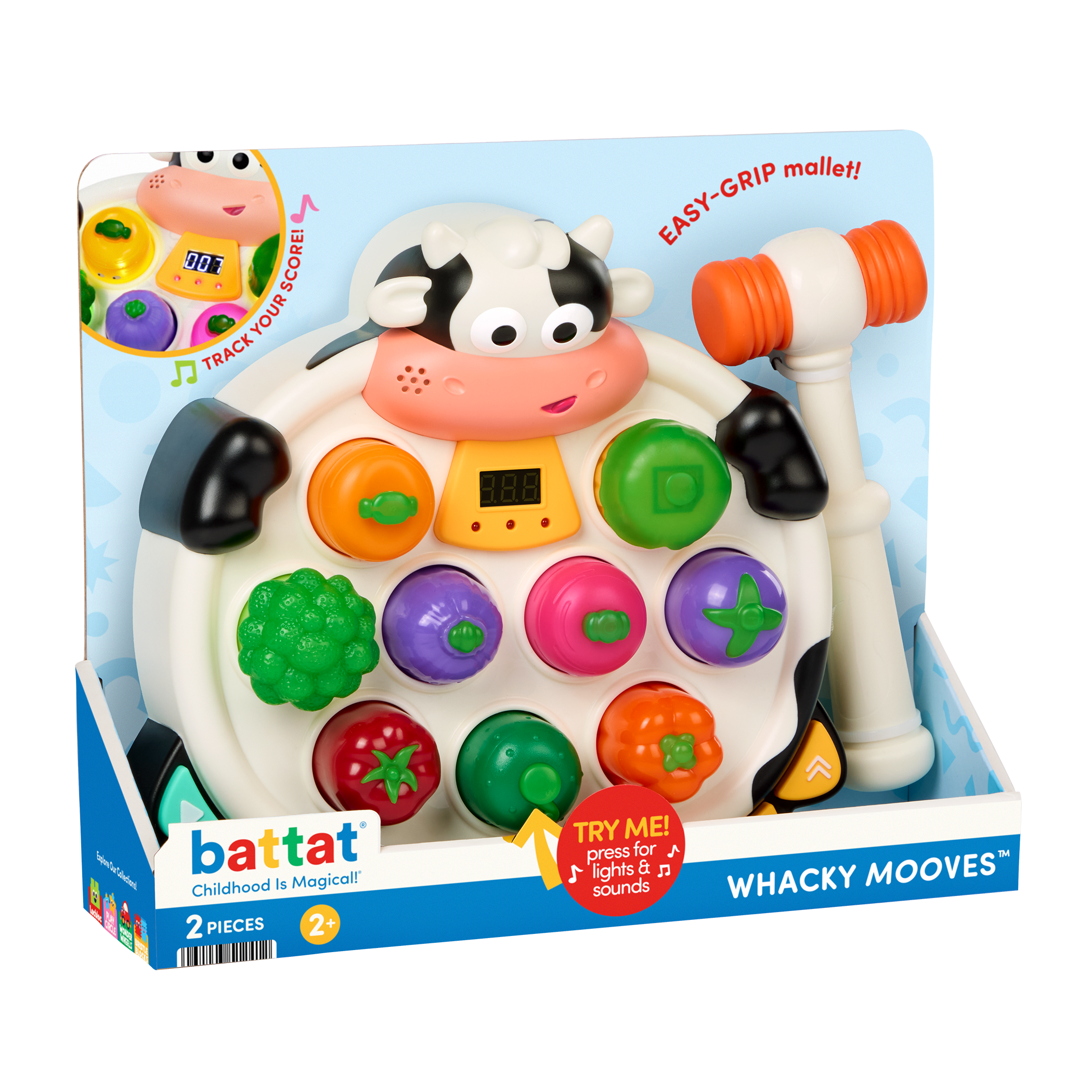 MOO-ve fast! Get ready to bop, bash, and giggle with Whacky Mooves™ by Battat – a light-up bop game packed with veggie-powered fun! Inspired by classic arcade whack games, this quirky twist swaps moles for expressive vegetables that light up – and make so many silly sounds! With two modes to choose from, little ones can tap around in Free Play or jump into the Veggie Bop Challenge, where tapping along to the music and quick reactions are key! Kids can control the tempo to match their speed, while the easy-grip mallet makes boppin’ a breeze. The more kiddos bop, the higher their score – giving them a sense of accomplishment! Silly faces equals serious fun with nine unique veggie characters to keep the action fresh – and parents will love the volume control. Whether you’re moooving fast or taking it slow, Whacky Mooves™ brings non-stop giggles to playtime! Bop ‘til you drop!