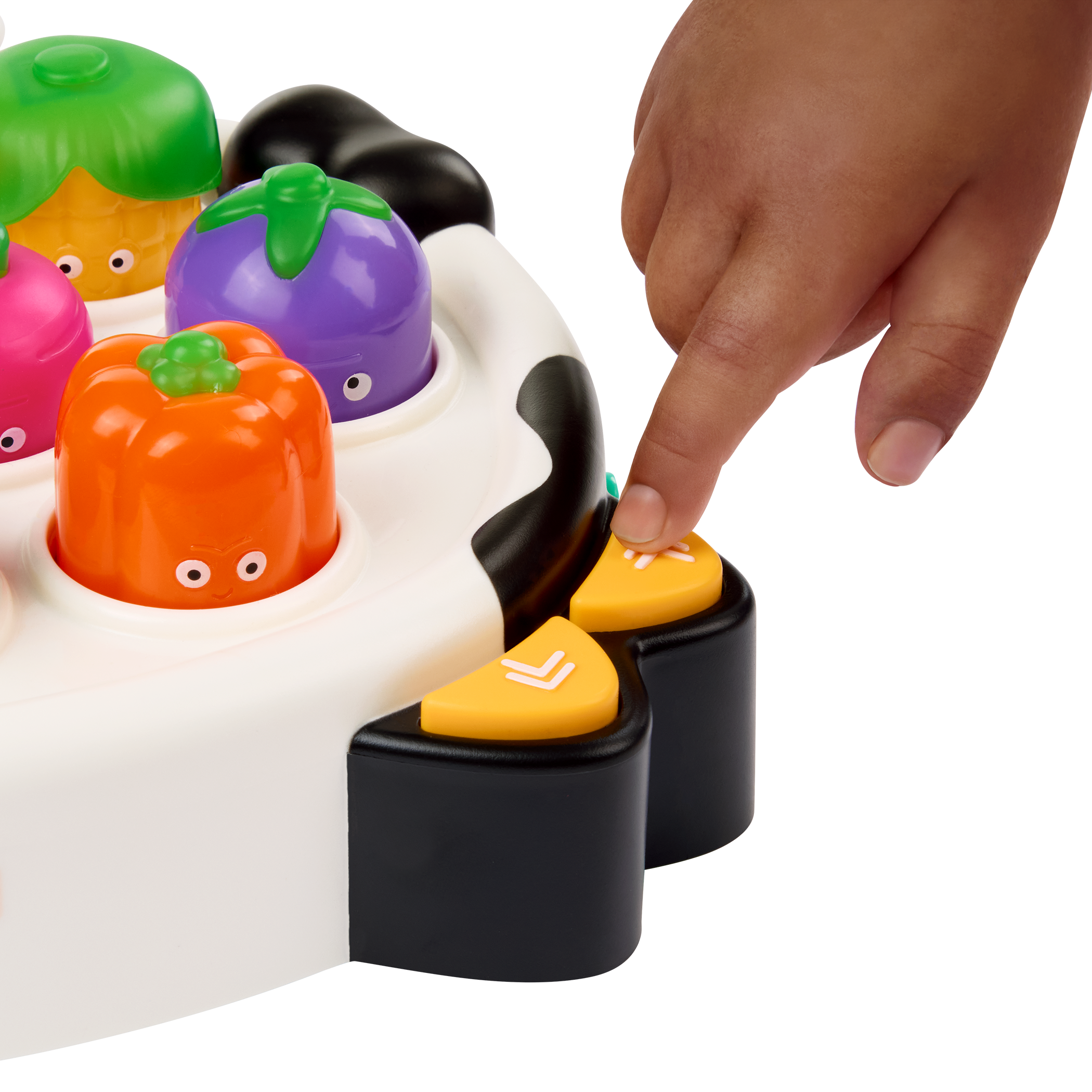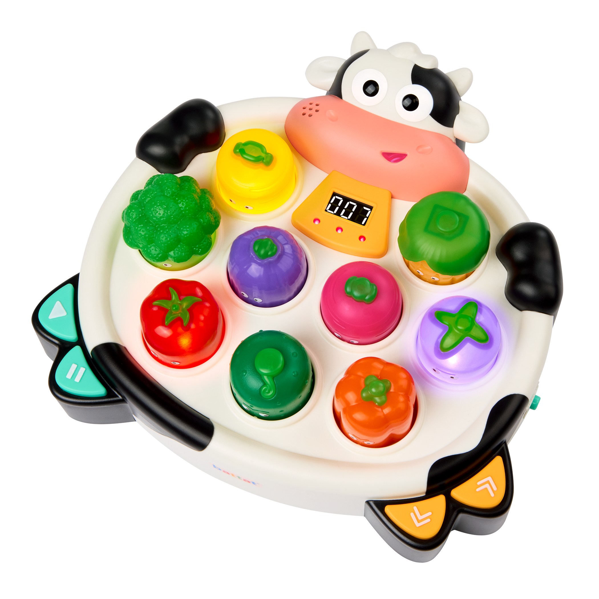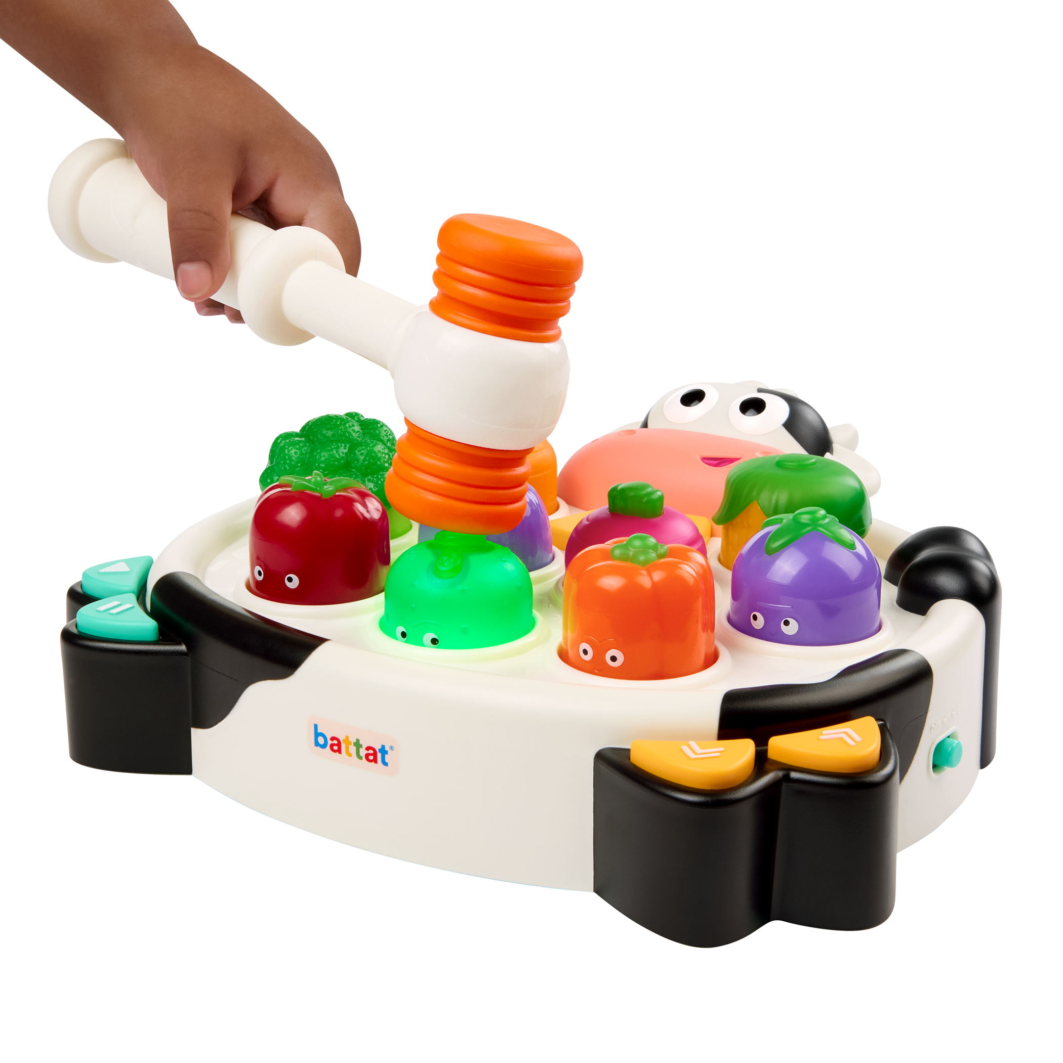 MOO-ve fast! Get ready to bop, bash, and giggle with Whacky Mooves™ by Battat – a light-up bop game packed with veggie-powered fun! Inspired by classic arcade whack games, this quirky twist swaps moles for expressive vegetables that light up – and make so many silly sounds! With two modes to choose from, little ones can tap around in Free Play or jump into the Veggie Bop Challenge, where tapping along to the music and quick reactions are key! Kids can control the tempo to match their speed, while the easy-grip mallet makes boppin’ a breeze. The more kiddos bop, the higher their score – giving them a sense of accomplishment! Silly faces equals serious fun with nine unique veggie characters to keep the action fresh – and parents will love the volume control. Whether you’re moooving fast or taking it slow, Whacky Mooves™ brings non-stop giggles to playtime! Bop ‘til you drop!